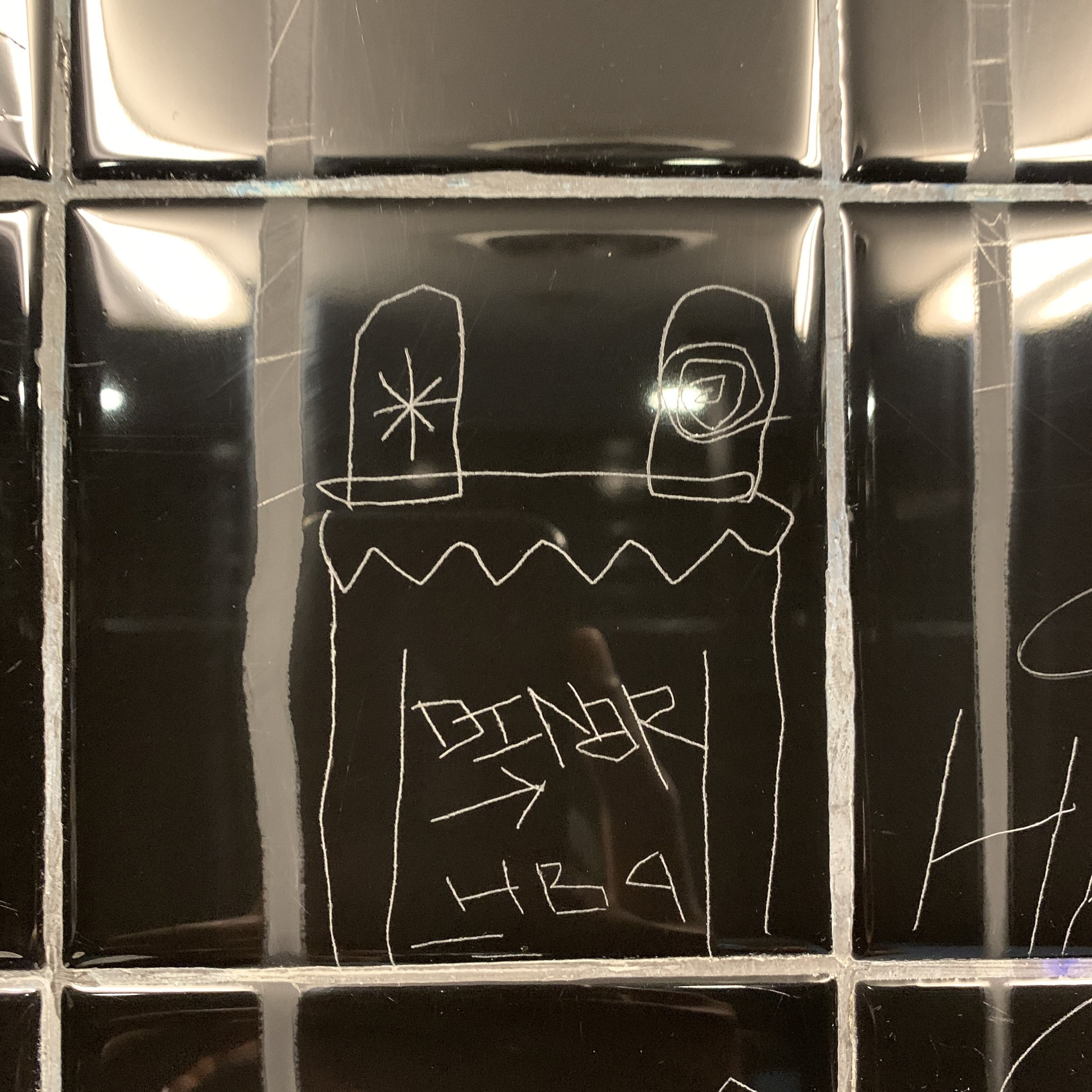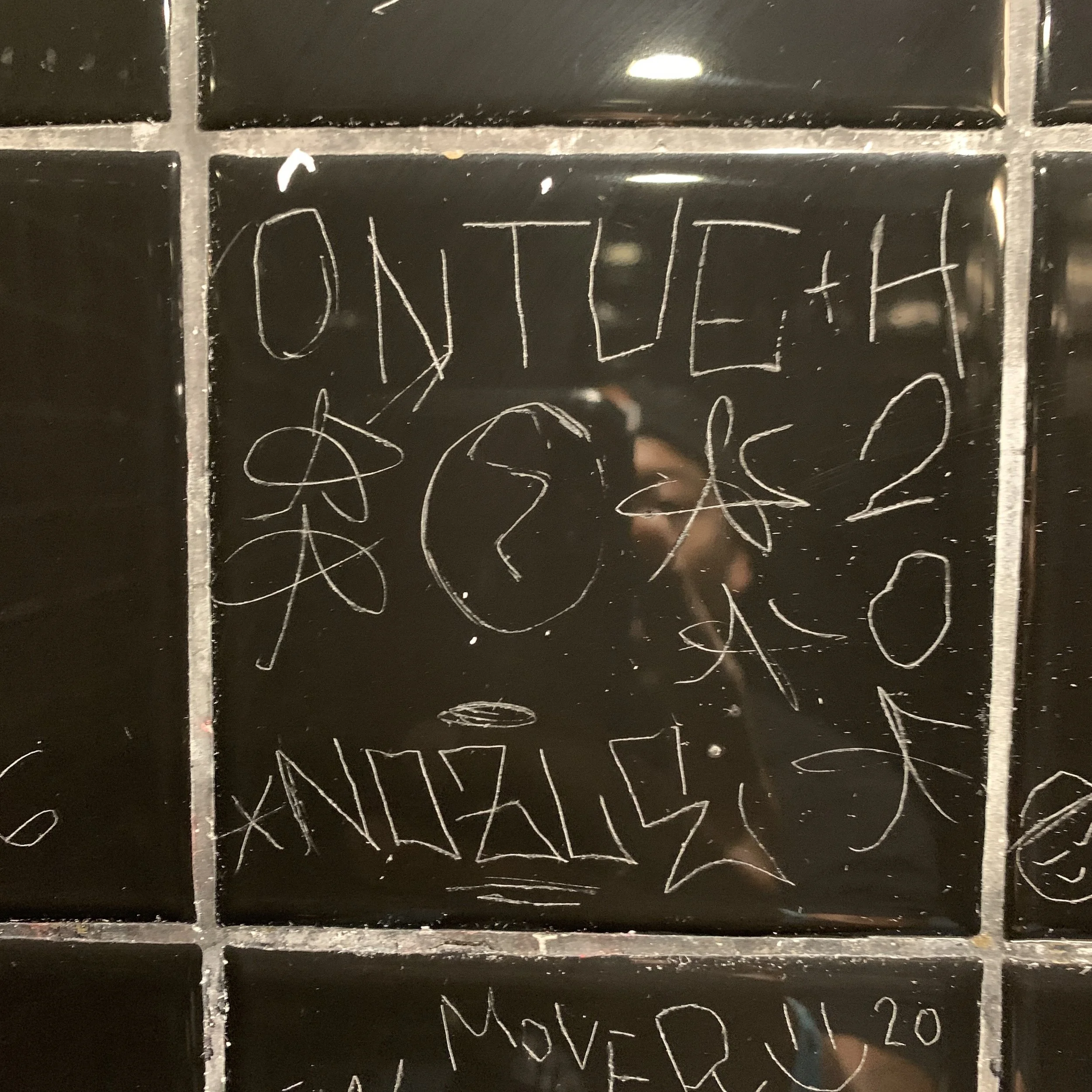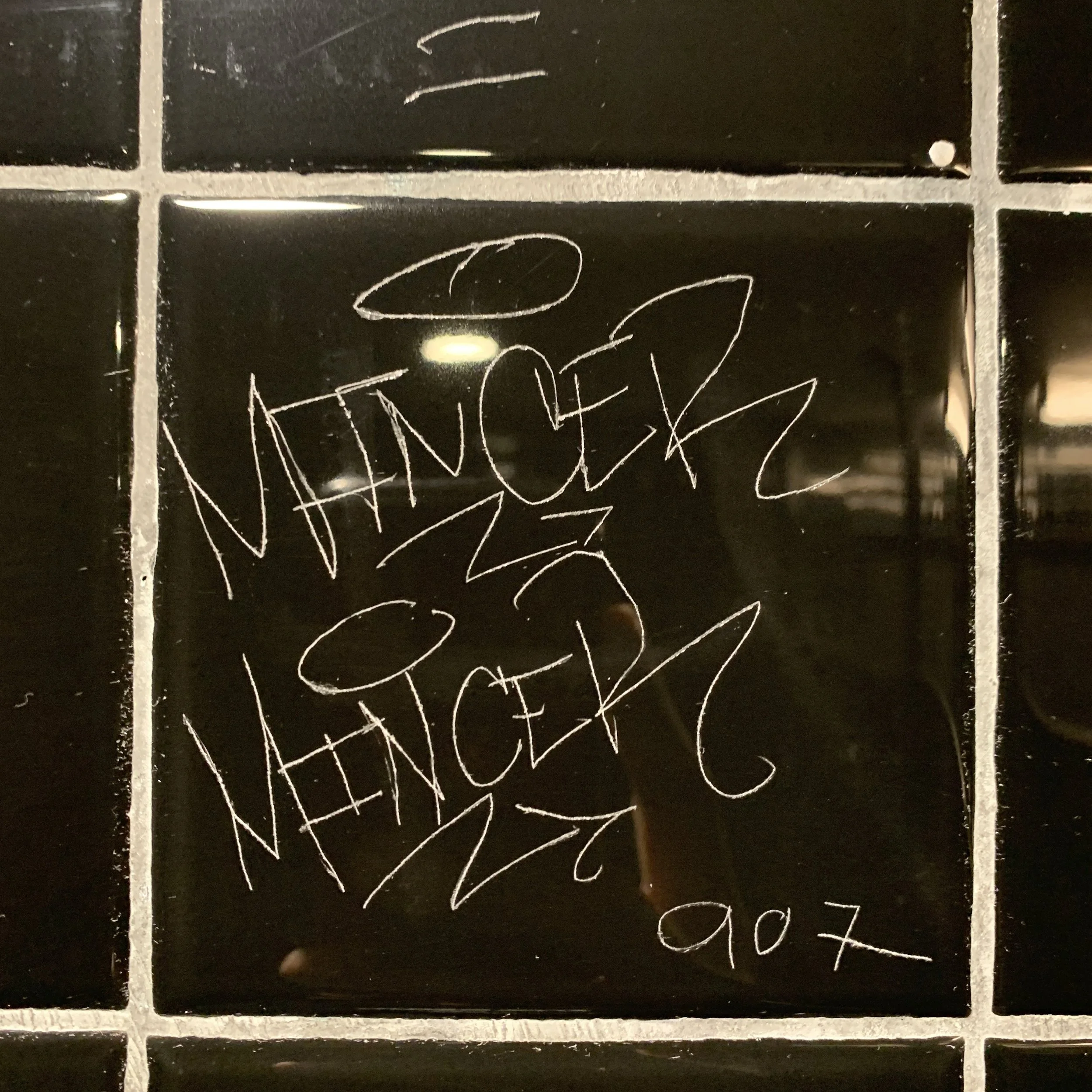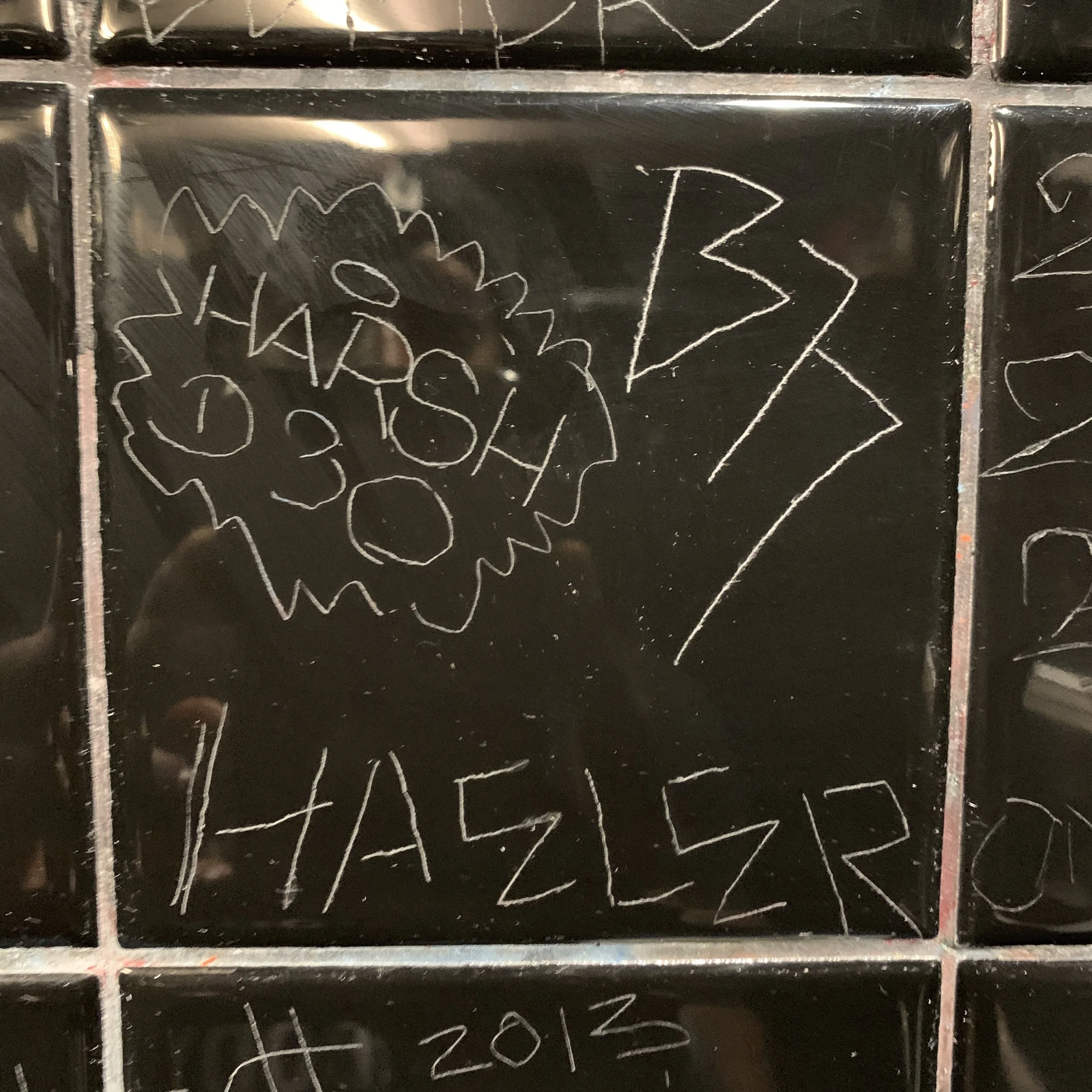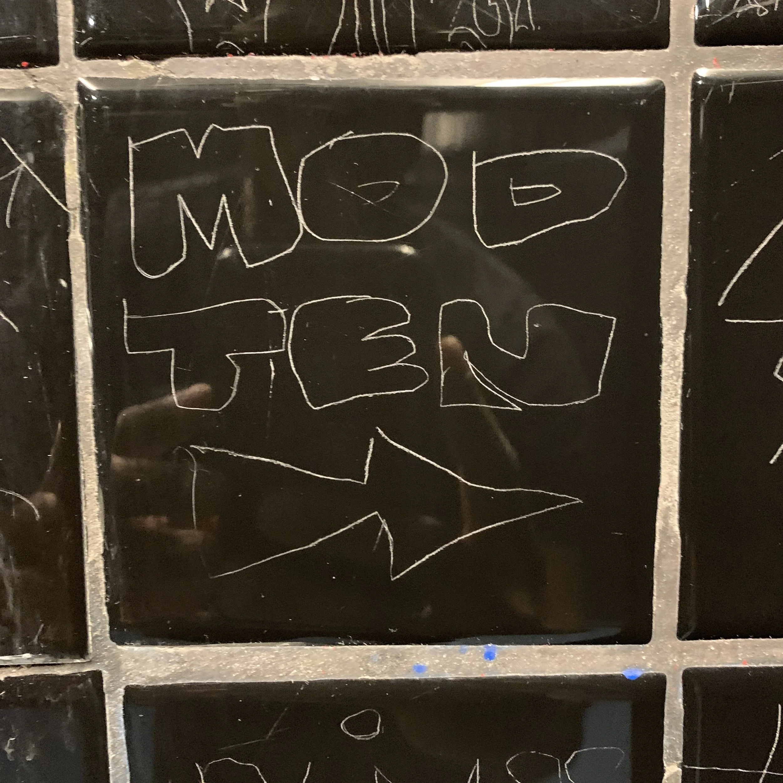 Black tile is the perfect canvas for public art. These were collected from the Garden Bowl in Detroit.