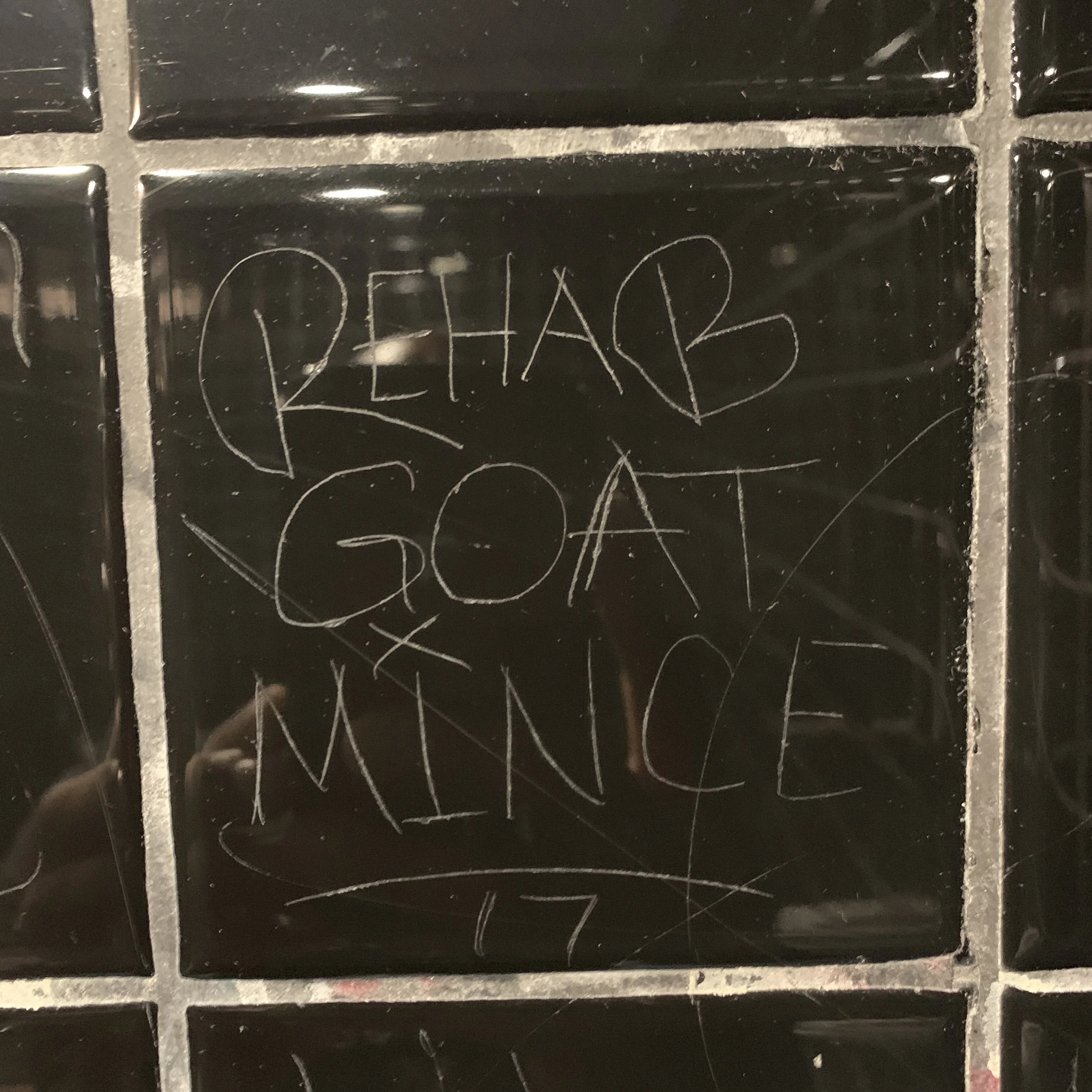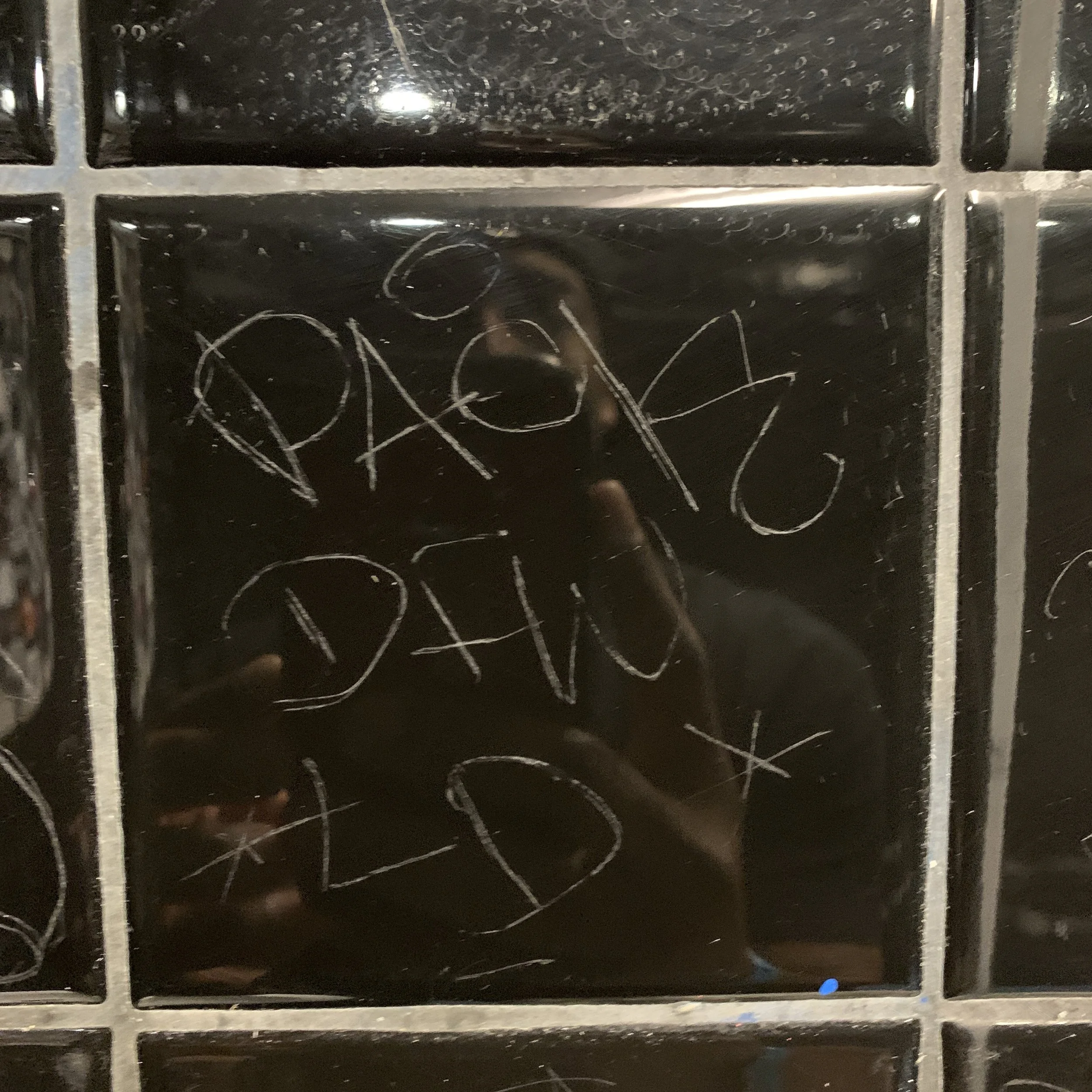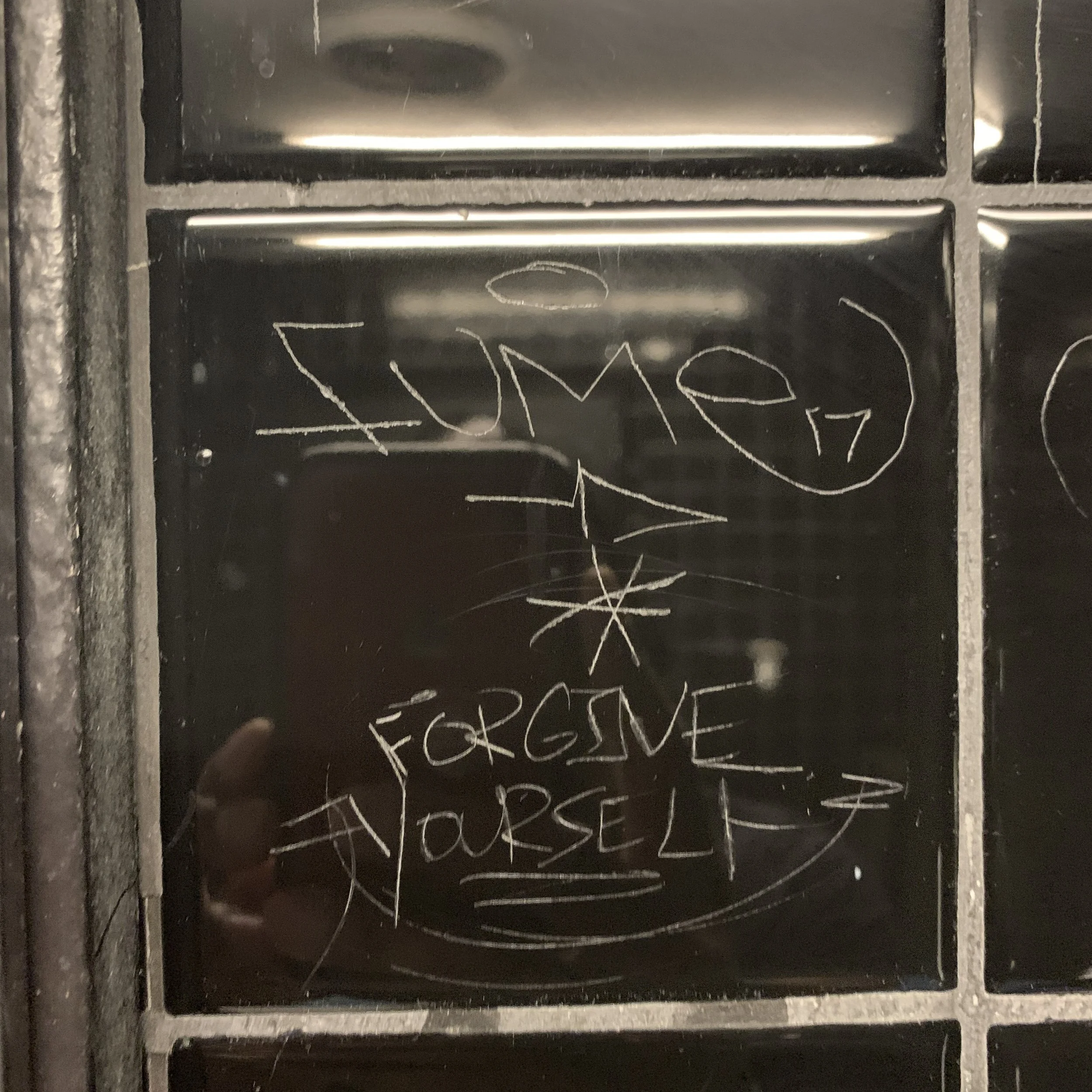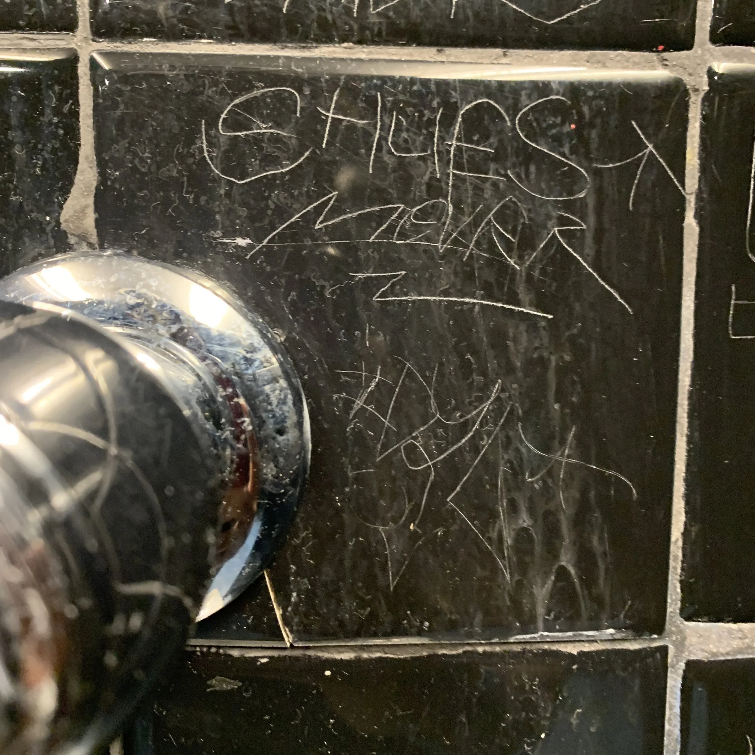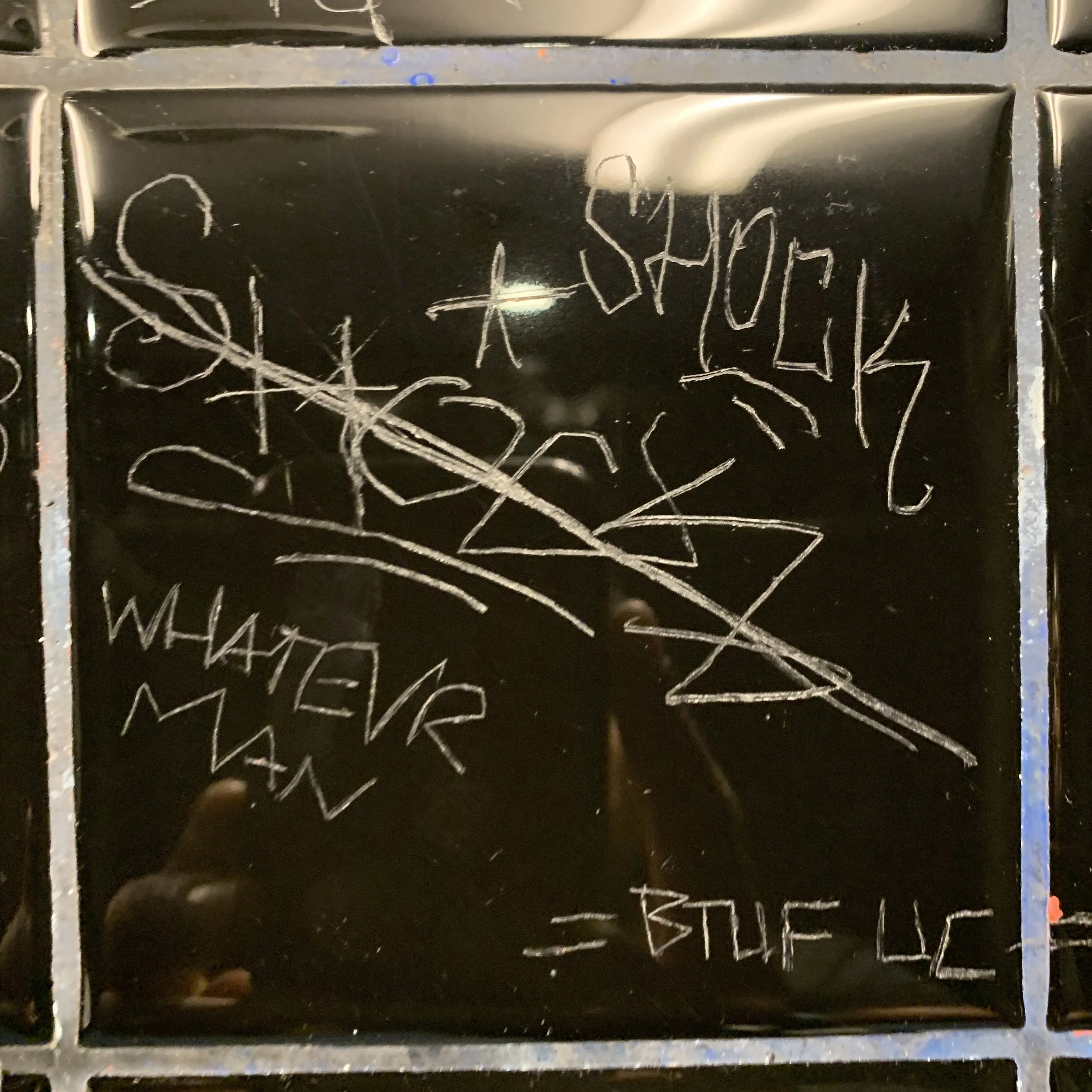 Black tile is the perfect canvas for public art. These were collected from the Garden Bowl in Detroit.